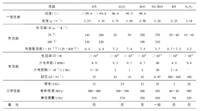 幾種陶瓷基片材料性能比較