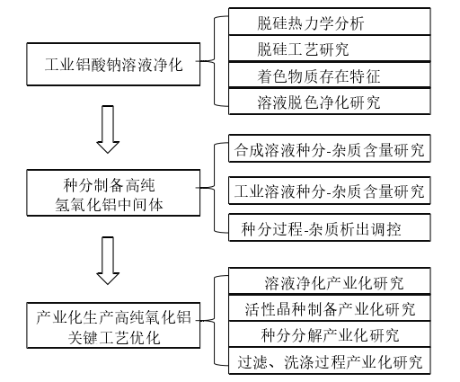 我國鋁土礦資源的特點決定了鋁土礦浸出液-鋁酸鈉溶液中硅含量較高,導致鋁酸鈉溶液制備的氫氧化鋁粉體純度較低,從而導致生產(chǎn)的氧化鋁純度較低,限制了氧化鋁的高附加值利用。因此,高純氧化鋁制備,需要針對不同雜質(zhì)、多步除去鋁酸鈉溶液中的雜質(zhì)。以鋁酸鈉溶液凈化脫硅、脫色,種分制備高純氫氧化鋁前驅(qū)體是可行的方法。