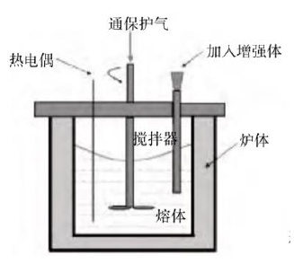 機械攪拌法是在攪拌的過程中將增強體顆粒加入到基體金屬液中,利用高速旋轉的攪拌裝置使增強體均勻混合入基體金屬液之中,然后澆入模具中得到想要的鑄件。其生產設備見圖2所示。機械攪拌法操作過程較為簡單,成本低廉,不到其他加工工藝的一半,是可以廣泛應用的方法,目前工業上制備復合材料大多數都是采用該方法。