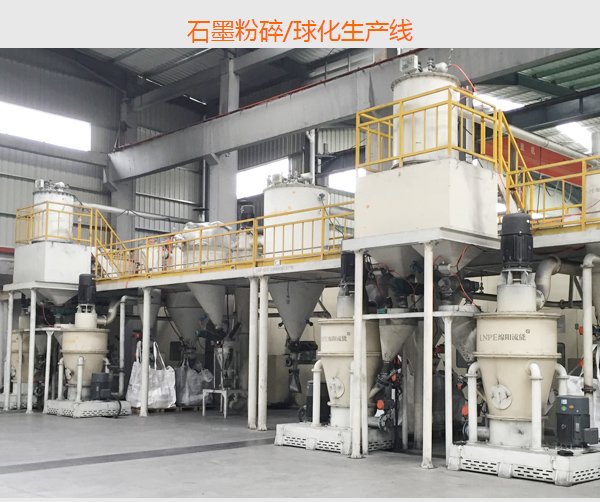 流能石墨(電池負極)材料粉碎整形機組采用一臺LNJP-120A-2型射流粉碎分級機及兩臺LNI-180A石墨整形機并聯生產,物料先通過射流粉碎分級機進行粉碎分級,出料粒度為5-40um的粉碎料及-5um的細粉;粉碎粉再通過螺旋輸送機進入整形分級機進行整形及細粉提凈,從而得到合格的球形化石墨(d10≥10um,d50=16-20um,d90≤40m)及-5um的細粉。