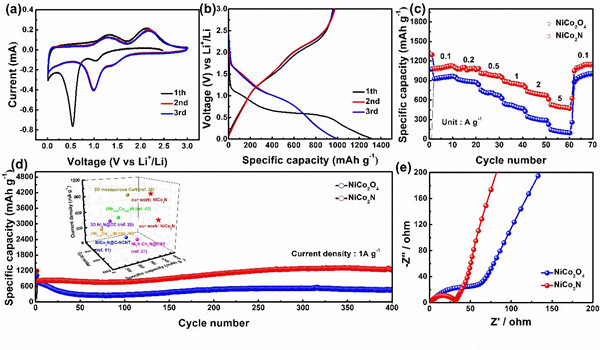圖2. NiCo2N電極的電化學測試結果:(a)在0.1 mV s-1掃速下的CV圖,(b)0.1 A g-1電流密度下的充放電曲線,(c)NiCo2O4和 NiCo2N電極在不同電流密度下的倍率性能圖,(d)NiCo2O4和 NiCo2N電極在1A g-1電流密度下的循環性能及其與其它Ni基和Co基氮化物材料的性能對比,(e)NiCo2O4和 NiCo2N電極的EIS圖。