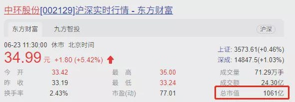 6月21日,中環股份股票市值重新突破1000億元大關,并且仍在持續增長。截至今日(6月23日)中午休市,中環股份股票報34.99元/股,漲幅5.42%,總市值達到1061億元。
