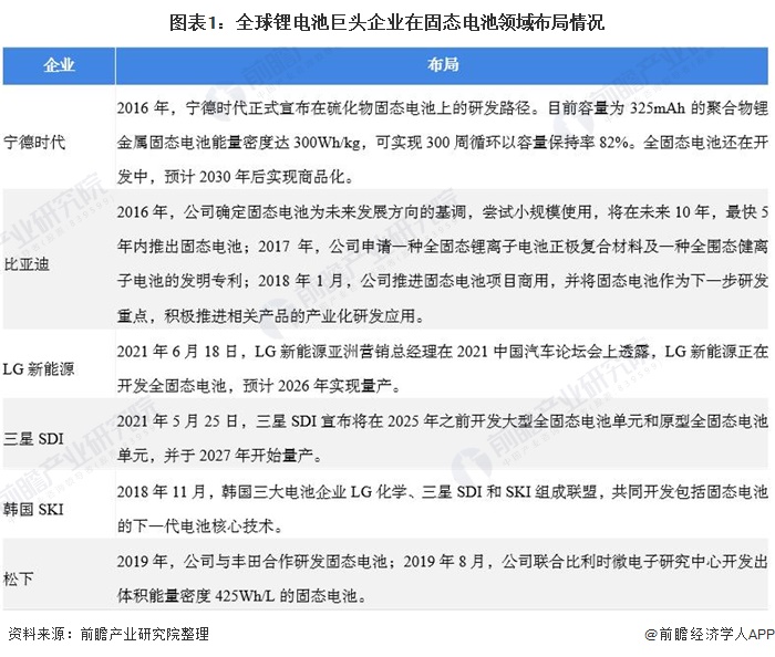 2021年6月18日,LG新能源亞洲營銷總經理在2021中國汽車論壇會上透露,LG新能源正在開發全固態電池,預計2026年實現量產。除LG新能源之外,寧德時代、比亞迪、三星SDI、韓國SKI、松下等全球鋰電池巨頭均在布局固態電池。