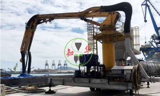 船運來的散裝粉料可通過氣力卸船機進行卸料,氣力卸船機通過液壓吸臂、吸嘴、管道將船艙內的粉料吸入高效分離器內部,吸來的料氣混合物在高效分離器內部進行料氣分離,分離后粉料落入分離器底部,分離器下方可布置卸料閥直接裝車,也可布置氣力輸送泵將粉料輸送至更遠的儲庫內儲存。