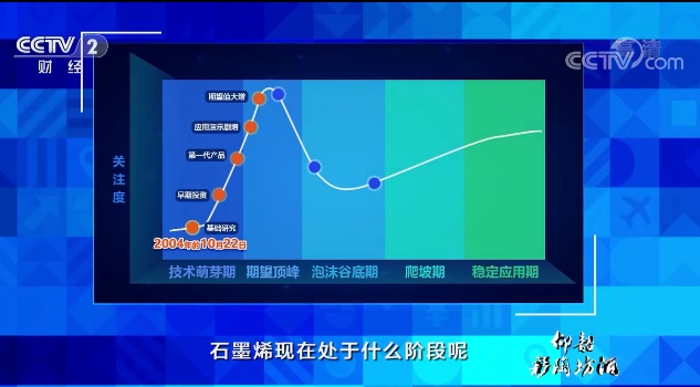 石墨烯現在處于什么階段呢?實際上我們認為還處于這樣一個階段:炒作的高峰漸漸過去了,市場也漸趨冷靜,F在盡管還有炒作的聲音,但實際上大家已經漸趨冷靜了。現在還不能說它會進入泡沫的谷底,但是需要有一段沉靜的時期,讓更多的人參與進來,去發展這個產業。最后才有可能真正走到最后,走到真正的大規模的應用,形成真正的石墨烯產業。