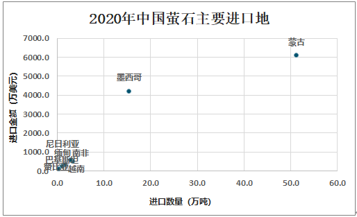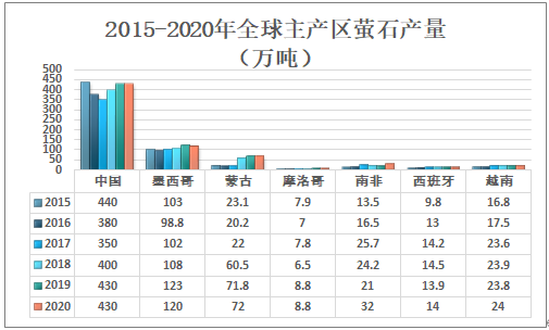 中國是全球最大的螢石產區(qū),2020年中國螢石產量為430萬噸;其次為墨西哥,螢石產量為120萬噸;蒙古螢石產量為72萬噸,南非螢石產量為32萬噸,越南螢石產量為24萬噸。