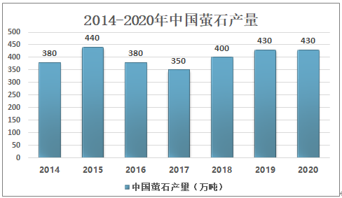 中國是全球最大的螢石生產國,產量維持在350-450萬噸之間,2020年中國螢石產量為430萬噸,產量較2019年基本持平,占全球螢石總產量的56.6%。