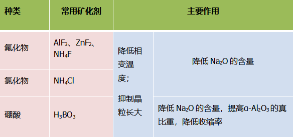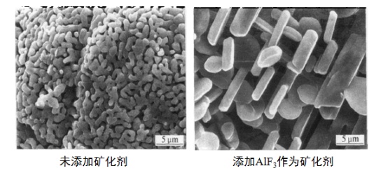 煅燒α-Al2O3的礦化劑主要包括硼系、氯系、氟系等礦化劑。礦化劑在煅燒α-Al2O3過程中的作用主要表現在降低煅燒溫度、促進α-Al2O3晶型轉化和降低α-Al2O3中氧化鈉含量。但具體來講,不同礦化劑對原晶粒度的影響不同,有的明顯促進原晶粒度的長大,有的具有良好的抑制晶粒長大的作用,而且,礦化劑對α-Al2O3晶粒的形貌產生一定的影響。