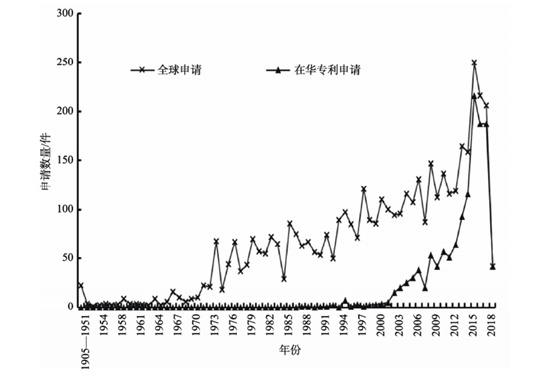 1905 年,Carborumdum 在碳化物先進陶瓷材料燒結技術領域申請了第一件專利。1905—1970年,碳化物先進陶瓷材料燒結技術全球專利申請量很少,幾乎在 20 件以下。該時期為碳化物先進陶瓷材料燒結技術的萌芽時期,技術研發處于探索階段。