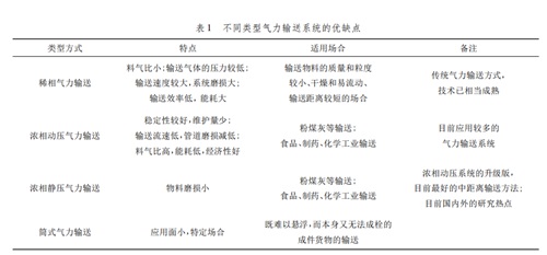 不同類型的氣力輸送系統具有不同的優缺點,詳見表1