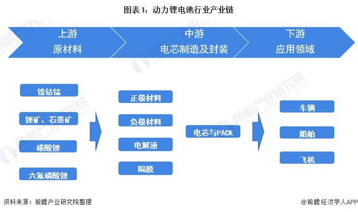 動力鋰電池的產業鏈上游原材料主要包括鎳鈷錳、鋰礦和石墨礦,由此構成正負極材料、電解液、電極基材、隔膜等;中游則是將正負極材料、電解液、電極基材、隔膜組裝成電芯后進行制造和封裝;下游是動力鋰電池的應用領域,主要應用在各種車輛、船舶、飛機等內燃機的啟動中。