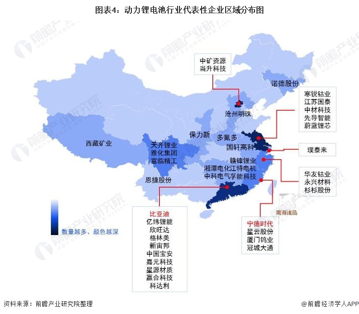 從代表性企業分布情況來看,廣東、江蘇、福建、四川、浙江等地代表性企業較多。動力鋰電池行業有寧德時代、比亞迪、國軒高科、億緯鋰能等。