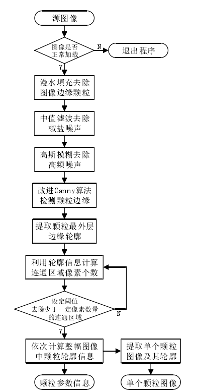 顆粒圖像處理算法對采集的顆粒圖像首先利用漫水填充方法去除與圖像邊緣接觸的顆粒;然后利用中值濾波去除圖像中的椒鹽噪聲、利用高斯模糊對圖像進行平滑濾波;通過改進Canny 邊緣檢測算法檢測顆粒邊緣;最后提取每個顆粒最外層邊界輪廓。利用提取的顆粒邊緣輪廓信息計算顆粒粒度粒形參數,同時將小于一定閾值的顆粒去除,最終保存圖像中所有有效顆粒的參數信息和單個顆粒原始圖像及其輪廓圖像。