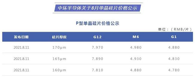 硅片方面,8月11日,中環(huán)股份公布8月單晶硅片定價(jià),與7月17日公布的報(bào)價(jià)相比,M6每片上漲0.44元;相較于6月報(bào)價(jià),G12每片上漲0.44元,G1每片上漲0.26元。