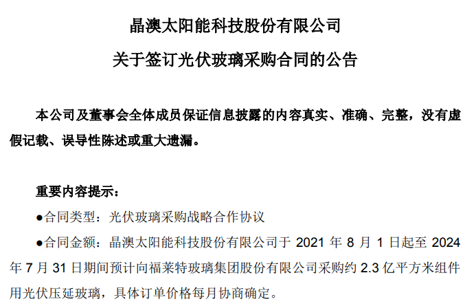 以光伏玻璃企業(yè)為例。近期,晶澳太陽能科技股份有限公司與福萊特玻璃集團(tuán)股份有限公司簽署光伏玻璃采購《戰(zhàn)略合作協(xié)議》。協(xié)議約定,公司及公司指定的控股公司于2021年8月1日起至2024年7月31日期間預(yù)計(jì)向福萊特及其指定的全資控股公司采購約2.3億平方米組件用光伏壓延玻璃,具體訂單價(jià)格每月協(xié)商確定。