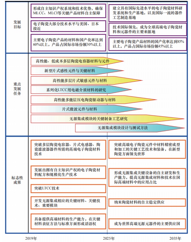 面向信息技術等領域的迫切需求,進一步加大電子陶瓷技術的研究開發及其產業升級的扶植力度,突破困擾該產業技術進步的關鍵技術,使我國在該領域的技術水平走進世界前列。力爭在2025 年大部分水平與美國、日本接近,2035 年成為全球高端電子陶瓷材料和元器件的主要來源地(見圖 2)。