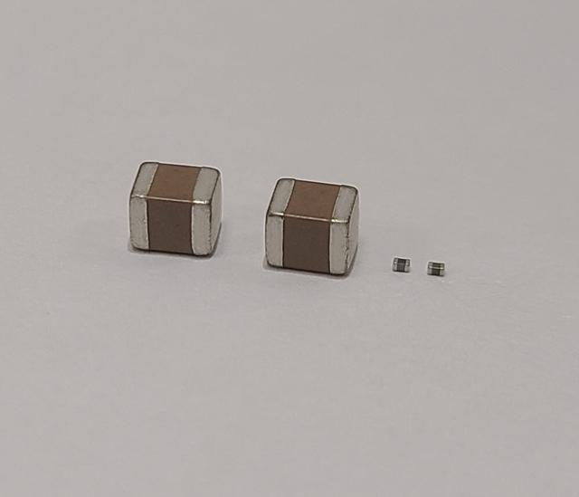 這兩種 MLCC 電容一個為 0603 規格(0.6mm 長,0.3mm 寬)100nF 容量,另一個為 3216 規格,容量 47μF。