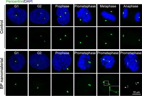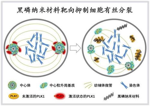 圖1.細(xì)胞有絲分裂過程中,遺傳物質(zhì)的精準(zhǔn)分配起始于紡錘體核心器件——中心體的正確分離。黑磷納米材料進(jìn)入分裂期細(xì)胞后,通過靶向并抑制中心體的分離,導(dǎo)致細(xì)胞分裂被阻斷在分裂早期