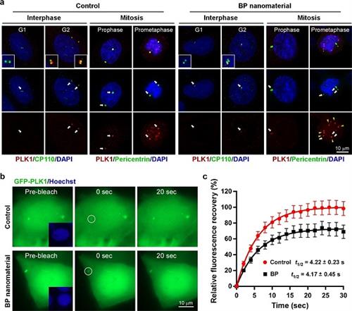圖2.PLK1是控制中心體正確分離的關(guān)鍵激酶,黑磷納米材料在細(xì)胞內(nèi)能夠與PLK1蛋白結(jié)合,促進(jìn)其異常聚集,導(dǎo)致PLK1無法被有效募集到中心體位置進(jìn)行活化,最終影響中心體的正常分離。a、黑磷納米材料處理細(xì)胞減弱了PLK1在中心體的定位;b-c、黑磷納米材料明顯減緩了PLK1向中心體的動(dòng)態(tài)募集