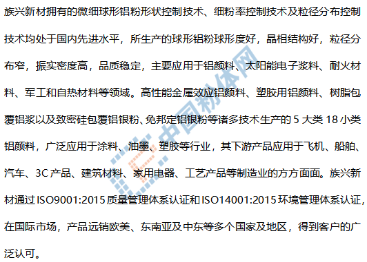 長沙族興新材料股份有限公司(族興新材)位于湖南省長沙市金洲新區,擁有微細球形鋁粉和鋁顏料生產的7大核心技術,24項授權發明專利和17項實用新型專利,主持制定3個鋁顏料行業標準,參與制定2個鋁顏料行業標準和3個涂料行業國家標準,專業從事微細球形鋁粉和片狀功能粉體材料的研發和生產經營,是微細球形鋁粉和鋁顏料行業中的知名企業。