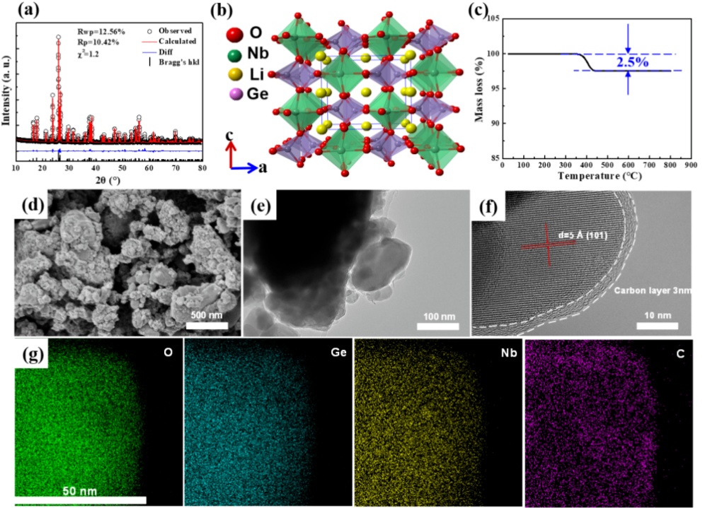 圖1. (a) LiNbGeO5@C的XRD圖和對應的Rietveld精修結果;(b) 精修得出的LiNbGeO5晶體結構圖;(c) LiNbGeO5@C的熱重曲線;(d)SEM圖;(e、f) TEM和高分辨TEM圖像;(g) LiNbGeO5@C中的元素分布。