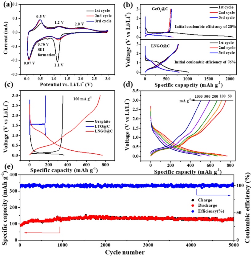 以LiNbGeO5@C和金屬鋰組裝成半電池的電化學數據如圖2所示。圖2(a)顯示了其在0.01-3V(vs. Na/Na+)電壓范圍內的循環伏安曲線。其還原峰出現在1.1 V、0.76 V和0.07 V,分別對應于LiNbGeO5@C的相變過程、SEI膜的形成和合金化過程。相反地,其氧化峰出現在0.5 V, 1.2 V 和 2.0 V,對應于去合金化反應以及Ge分步氧化成GeO2。將LiNbGeO5@C與GeO2@C的充放電曲線進行對比,LiNbGeO5@C能夠提供更高的可逆比容量(785 mAh g-1)和更高的首圈庫倫效率(76%)。圖2(c) 則對比了商業化石墨、鈦酸鋰與LiNbGeO5@C的電化學性能,相較于石墨和鈦酸鋰,LiNbGeO5@C具有更高的比容量和適中的工作電位。在50、100、200、500和1000 mAg-1的電流密度下,其可逆放電比容量分別為768.5、720.8、675、601和512 mAh g-1。在10 A g-1(~75 C)的大電流密度下,該材料仍能提供135 mAh g-1的比容量,循環超過5000次。