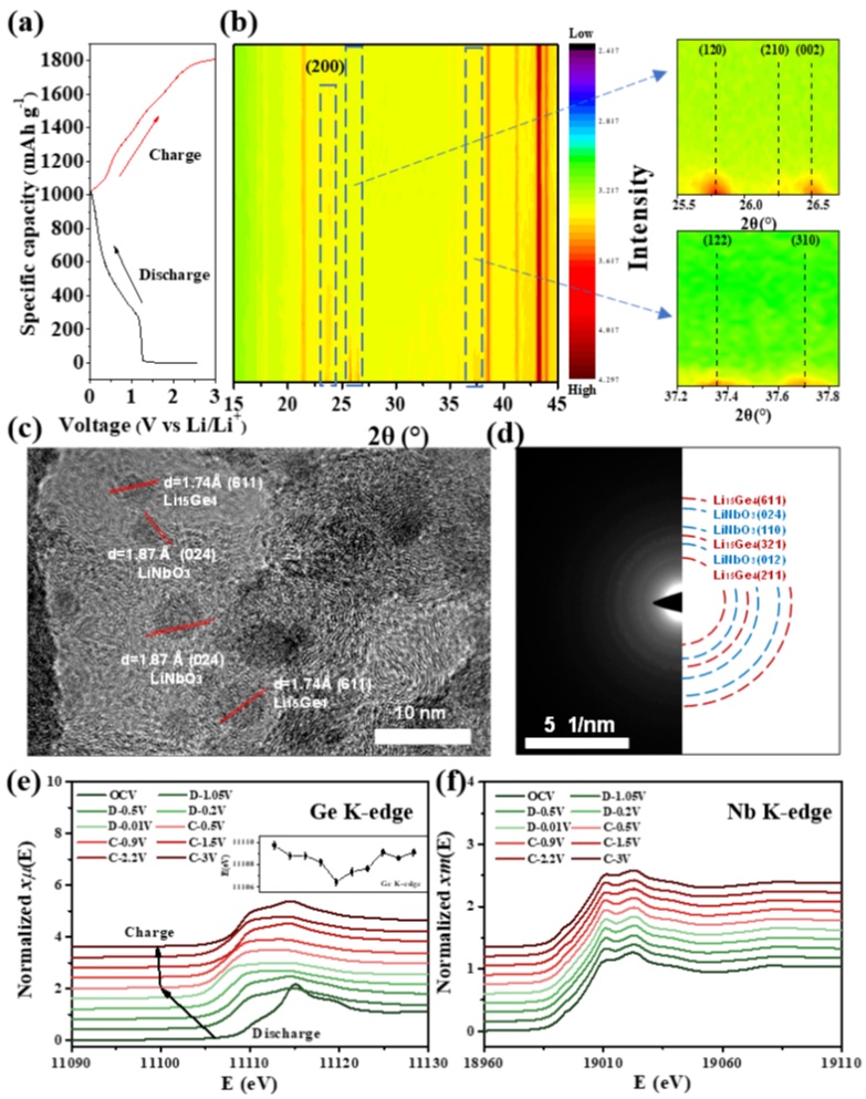 圖4. (a) 對應的LiNbGeO5@C充放電曲線;(b) 原位XRD圖譜;(c) 完全放電狀態時LiNbGeO5@C的高分辨TEM圖像;(d) 完全放電狀態時LiNbGeO5@C的選區電子衍射圖像;(e) 不同充放電狀態下的Ge近邊吸收圖譜;(f) 不同充放電狀態下的Nb近邊吸收圖譜。