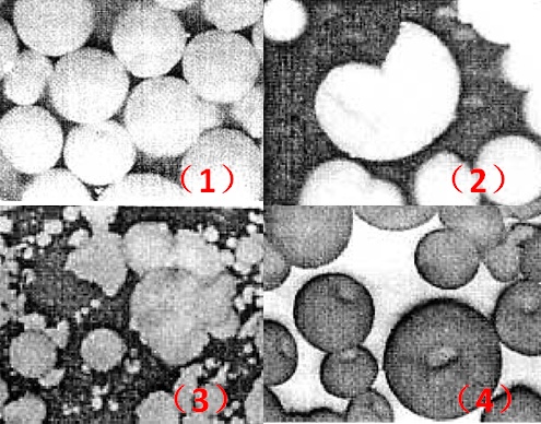 流動性最好的顆粒形狀應該是圓球狀。可是在生產過程中,由于種種原因,造粒粉卻往往會形成非圓球狀。造粒粉顆粒的典型形狀有以下四種: