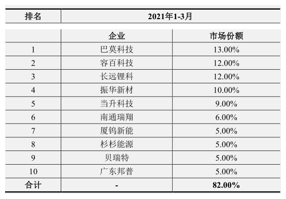 2021年1-3月,隨著下游市場需求恢復、公司高鎳8系三元材料大批量供貨及前期推遲訂單恢復執行,公司當期營業收入增長較快,實現扭虧為盈。根據鑫欏資訊數據,2021年一季度,發行人市場份額為10%,市場份額回升,位列第四名。