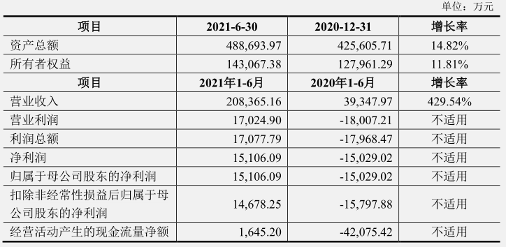 招股說明書顯示,隨著國內新冠疫情得到有效控制,2021年上半年我國新能源汽車終端市場快速回暖,帶動上游新能源汽車動力電池及三元正極材料市場需求快速增長。2021年1-6月,公司實現營業收入208,365.16萬元,較上年同期增長429.54%;另外公司實現歸屬于母公司股東的凈利潤15,106.09萬元,扭虧為盈并實現大幅增長。