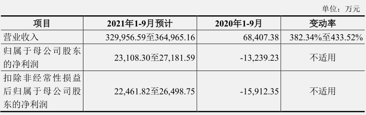 受下游新能源汽車終端市場需求快速增長、公司毛利率相對較高的高鎳8系三元材料銷售收入規模擴大及前期推遲訂單恢復執行影響,預計公司2021年1-9月實現營業收入329,956.59萬元至364,965.16萬元,同比增長382.34%至433.52%,預計實現歸屬于母公司股東的凈利潤23,108.30萬元至27,181.59萬元,預計實現扣除非經常性損益后歸屬于母公司股東的凈利潤22,461.82萬元至26,498.75萬元。