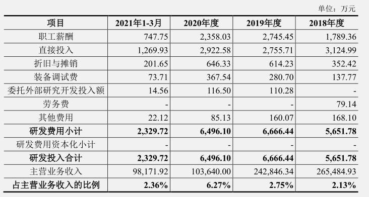 公司一貫以來重視研發投入,對新產品與新技術開發等方面持續加大資金支持。報告期內,公司研發費用分別為5,651.78萬元、6,666.44萬元、6,496.10萬元、2,329.72萬元,研發投入占營業收入比例分別為2.13%、2.75%、6.27%、2.36%。