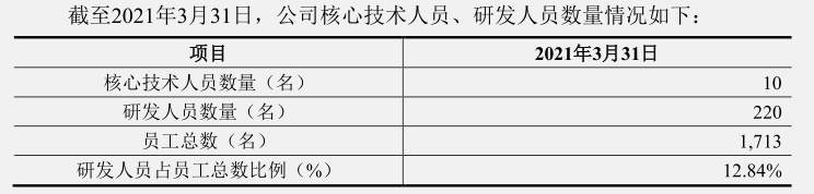 另外截止2021年3月31日,公司有研發人員220人,占員工總數的12.84%。