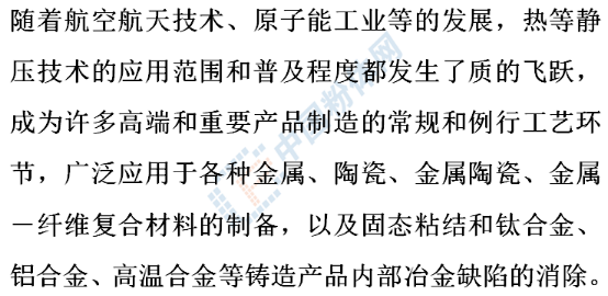 中國粉體網訊 熱等靜壓是一種利用高溫高壓同時作用使金屬或陶瓷制品經受各向同等壓力從而使制件得以燒結和致密化的工藝技術。它具有化學成分穩定、力學性能各向同性、結構適應性好、成本較低的優點。