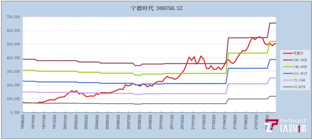 考慮到公司未來的成長性,我們用PEG方法對公司股價進行一下分析,可以看到公司PE(TTM)從2020年以來保持了快速的增長,目前PE較7月份有所下降,目前在144左右,公司2021年上半年凈利潤增速為148.38%, 如果僅是根據上半年凈利潤增速來看,PEG小于1,以目前凈利潤的增速是對股價有支撐的,但是考慮到未來三五年內公司凈利潤維持如此高的增速基本是很困難的,這也就說明市場目前對公司的估值其實是相當樂觀的,或許寧德時代已經考慮到這一點,而目前積極開發鈉電池,尋找新的利潤增長點正是主要的應對措施之一。
