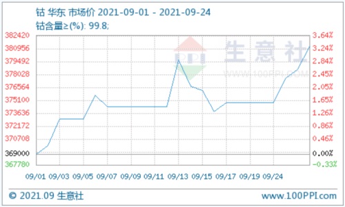 中國粉體網訊 根據生意社數據監測顯示:9月24日國內鈷市延續漲勢,鈷價上漲,國內鈷市行情上漲。9月24日,鈷價381200.00元/噸,較上一交易日(9月23日)鈷價378600.00元/噸上漲,漲幅0.69%。