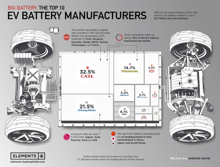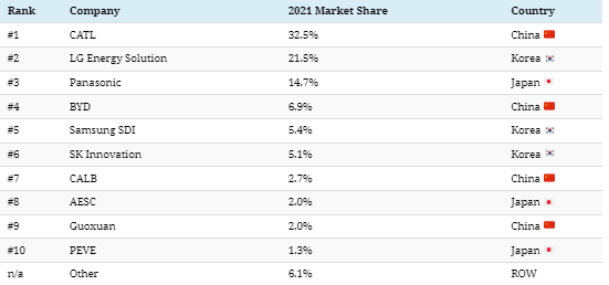 根據(jù)SNE研究公司的數(shù)據(jù),前三大電池制造商CATL、LG和松下吞下了近70%的EV電池制造市場(chǎng)。