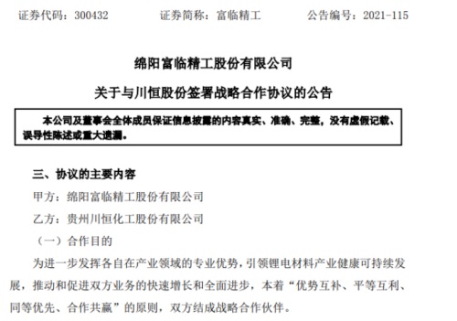 1、富臨精工與川恒股份在磷酸鐵鋰正極材料領域達成合作