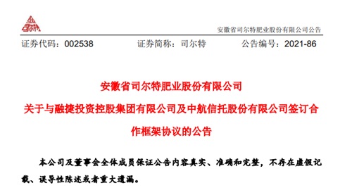 9月21日晚間,司爾特(安徽省司爾特肥業股份有限公司)發布公告稱,公司擬與融捷投資控股集團有限公司、中航信托股份有限公司簽訂合作框架協議,就合作開發磷礦資源、合資生產磷酸鐵和磷酸鐵鋰產品等相關合作內容進行約定。股權結構為:公司持有磷酸鐵鋰公司70%的股權,融捷投資持有磷酸鐵鋰公司30%的股權。