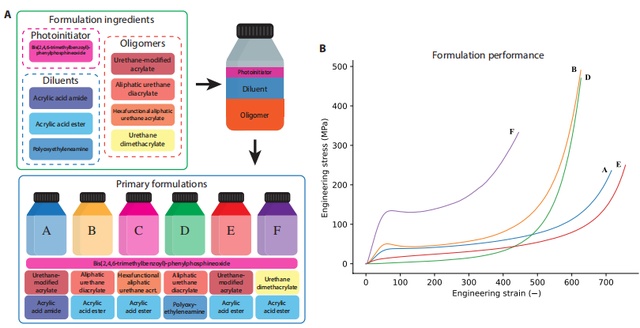 具體而言,關于基本成分和材料配方,研究人員首先生成了一組相互兼容的光固化初級配方,以混合并具有不同的機械性能,當然,他們并不是從頭開始開發打印材料,而是首先確定了八種商用配方成分(包含一種光引發劑、三種稀釋劑和四種低聚物),然后,六種主要配方(A 至 F)由庫中的八種主要成分組成。