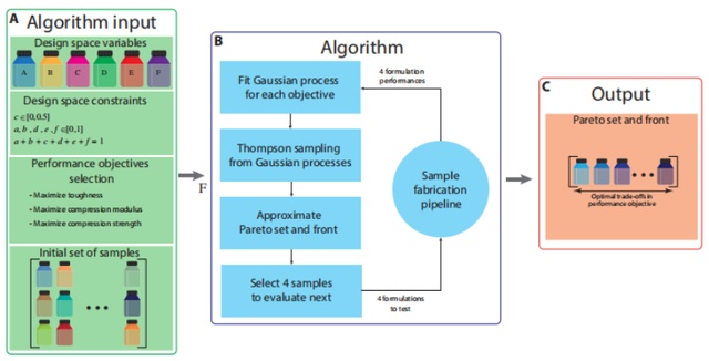 為了最大限度地減少測試不同配方所需的資源,并快速找到更好的性能設計,研究人員使用了基于貝葉斯優化的數據驅動方法(圖 F)。