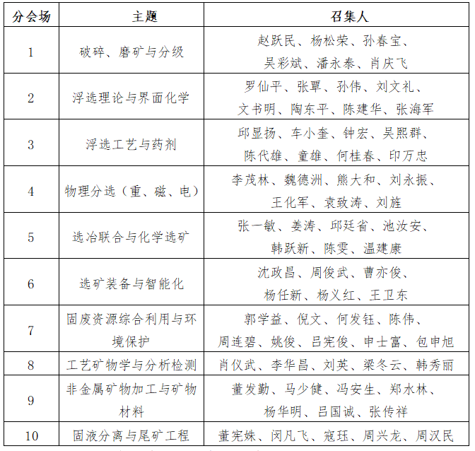 本屆會議的主題是:綠色、智能、共享、創新。旨在探討新形勢下礦物加工科學技術的綠色智能發展,推動礦物加工領域的技術創新。會議專題涵蓋選礦理論與技術、選礦裝備及智能化、礦冶環保、城市礦山、工藝礦物學與分析檢測、礦物材料等技術領域的基礎和應用研究;會議內容包括大會特邀報告、分會場邀請報告、口頭報告和專題學術論壇等,還將組織與礦物加工有關的知名廠商作相關產品展示與技術交流。會議期間學術委員會將頒發“2021中國礦物加工優秀青年論文獎”。