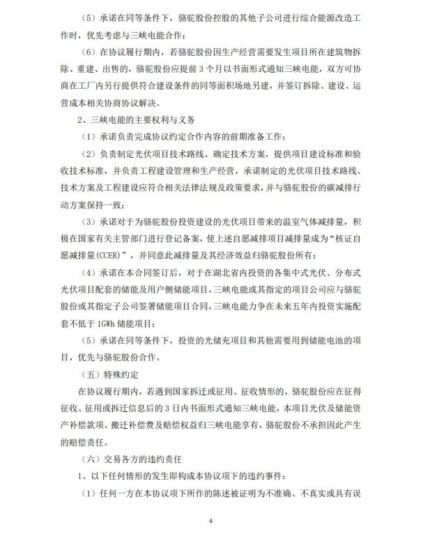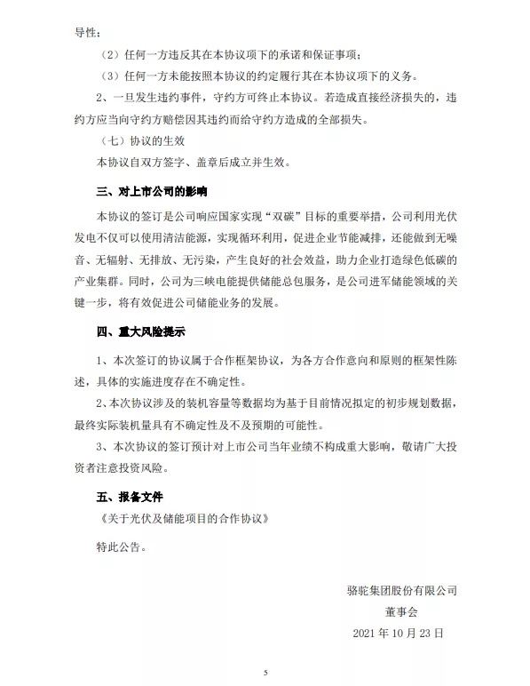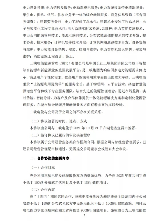 中國粉體網訊 10月22日,駱駝股份公布,公司與三峽電能能源管理(湖北)有限公司(“三峽電能”)于2021年10月21日簽訂了《關于光伏及儲能項目的合作協議》,各方擬在光伏項目及儲能項目等領域展開合作。