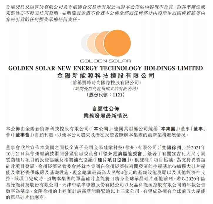 中國粉體網訊 10月22日,金陽新能源自愿性公布業務發展最新情況公告,該集團的間接全資子公司金陽硅業科技(徐州)有限公司(金陽徐州)于2021年10月21日與徐州經濟技術開發區管理委員會(徐州經濟區管委會)簽署了有關20GW大尺寸異質結硅片項目的投資協議及相關補充協議。