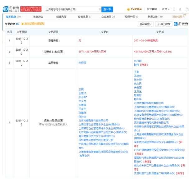 中國粉體網(wǎng)訊 企查查APP顯示,10月22日,上海瞻芯電子科技有限公司發(fā)生工商變更,新增湖北小米長江產(chǎn)業(yè)基金合伙企業(yè)(有限合伙)等為股東,同時(shí)公司注冊資本由3571.43萬元人民幣增加至4375萬元人民幣,增幅為22.5%。