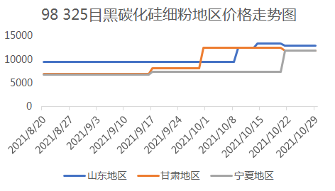 從報告中我們了解到,截止至發稿,山東地區綠碳化硅微粉系列的反應燒結用的W14、W10的主流價格在17000-19000元/噸,另外無壓燒結用的W0.5的主流價格在25500元/噸,F240的主流價格在18000-19500元/噸。山東、甘肅地區黑碳化硅細粉磨料用98 325目主流價格是11000-13000元/噸。山東地區重結晶碳化硅用Rs07主流價格在28000元/噸。