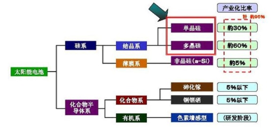 太陽(yáng)能電池作為一種清潔能源受到世界范圍內(nèi)的廣泛重視。太陽(yáng)能電池的主要分類如下圖所示,多晶硅的轉(zhuǎn)化效率及產(chǎn)量高,而且對(duì)原料要求相對(duì)較低,因此是產(chǎn)業(yè)化比率最高的材料。