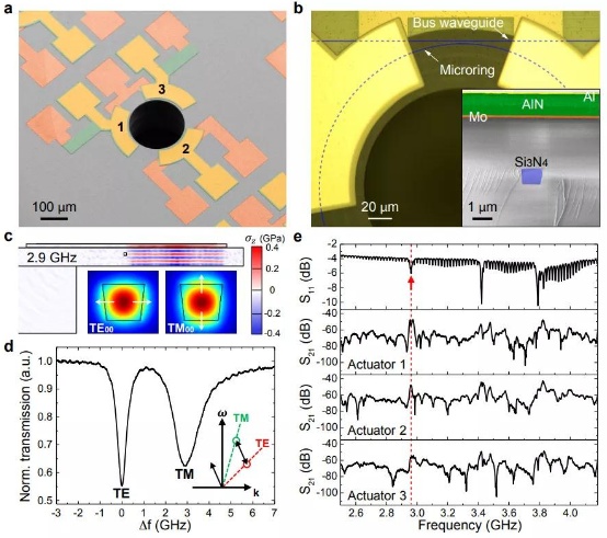在氮化硅制成的微環諧振器(microring resonator)上,他們等間距地集成了三個氮化鋁(AlN)體聲波諧振器。氮化鋁(AlN)材料作為一種高效成熟的壓電材料,目前已經被廣泛應用在無線通訊領域,基于氮化鋁的體聲波濾波器幾乎被應用在每一個手機芯片上,以接收無線信號。壓電材料是一種可以因機械變形產生電場的材料,家家戶戶都可見到的煤氣灶便是運用了壓電效應:扭動開關,壓力產生的電流可以幫助煤氣灶迅即燃起藍色火焰。田浩與劉駿秋便是利用氮化鋁來激發聲波。當聲波經過光學微環諧振腔的時候,聲波產生的壓力會改變光波導的折射率,同時也會改變波導的形狀。這兩個效應加在一起就對光波導產生了調制作用,而調制的頻率就是聲波震動的頻率,一般是幾個吉赫茲(GHz)。