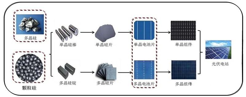 光伏發(fā)電靠光伏電池板,光伏電池板的主體是光伏電池片。光伏電池片可以用多晶硅材料,經(jīng)直拉單晶爐拉制過程生成直拉單晶晶棒,或經(jīng)鑄錠過程生成多晶/單晶鑄錠。直拉硅棒或鑄錠硅錠,經(jīng)去皮、切方、切片、選片,制成光伏電池片,依工藝路徑分單晶電池片、多晶電池片/鑄錠單晶電池片,如下圖所示。