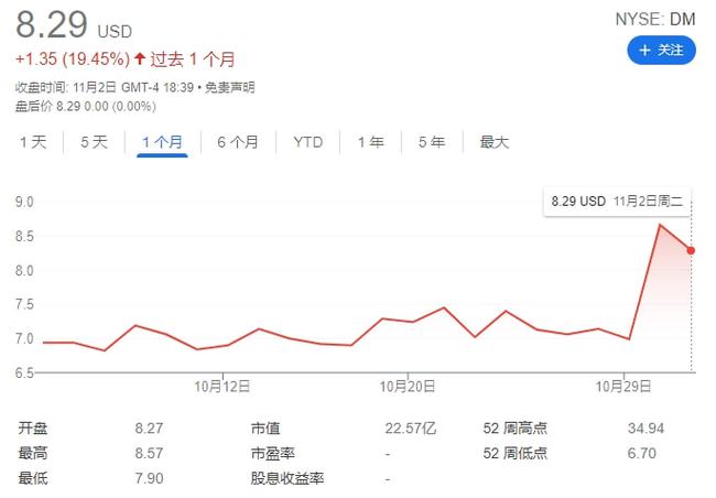 中國粉體網訊 2021年11月1日,Desktop Metal的股價突然迎來了近一個月以來的大漲,最高升至每股8.66美元(約55.42人民幣)。截至帖子發布,雖然有稍許回落,但股價仍穩定在8.29美元(約53.06人民幣)。